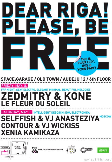 selffish and his friend vj anasteziya from moscow, russia are going to demonstrate their audio-visual collaboration in terms of live performance duo at the intelligent riot/debauch party this saturday night at space::garage - a nice club with warm atmosphere and splendid view through its windows (especially in the mornings), located right in the heart of the old town of riga. vj anasteziya is the professional animation artist who has been vjing for quite a while already, and her visuals really make a difference but we'll leave it up to you to judge, so you're welcome aboard! the "intelligent debauch" party starts on may 9th, 2009. featured artists: selffish & vj anasteziya; contour & vj wickiss; xenia kamikaza.
