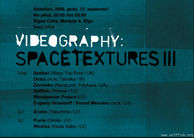 the "spacetextures iii" project will feature video- and audio- art from england, slovenia and latvia. it is a continuation of the videography events of the annual "balta nakts" festival. the event takes place at the riga circus (!) on merkela street 4, september 12, 2009 20:00 - 05:00. featured artists: seefeel (warp; too pure / uk), octex (rx:tx; tehnika / si), zavoloka (nexsound; polyfusia / ua), selffish (thinner; native state / lv), woodpecker project (lv), evgeny droomoff / sound meccano (rx:tx / lv), snobo (yaputhma / lv). vjs: punte (orbita / lv), wickiss (klusa daba / lv)