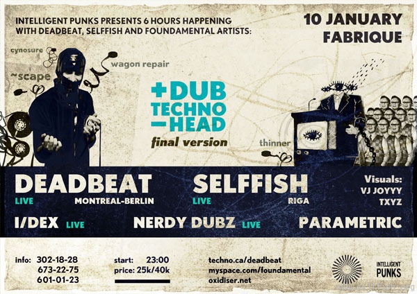 intelligent punks present a six hour happening with deadbeat, selffish and foundamental artists: i/dex, pavel ambiont & nerdy dubz and parametric on saturday, 10 january 2009. the event will take place at club "fabrique" in minsk, belarus. this is the second time selffish visits minsk and he will be happy to meet old and new friends after a while!